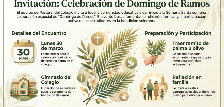 El equipo de Pastoral invita a la celebración especial de Domingo de Ramos. Queremos que este sea un espacio de encuentro, reflexión y fe para todos nuestros estudiantes.
